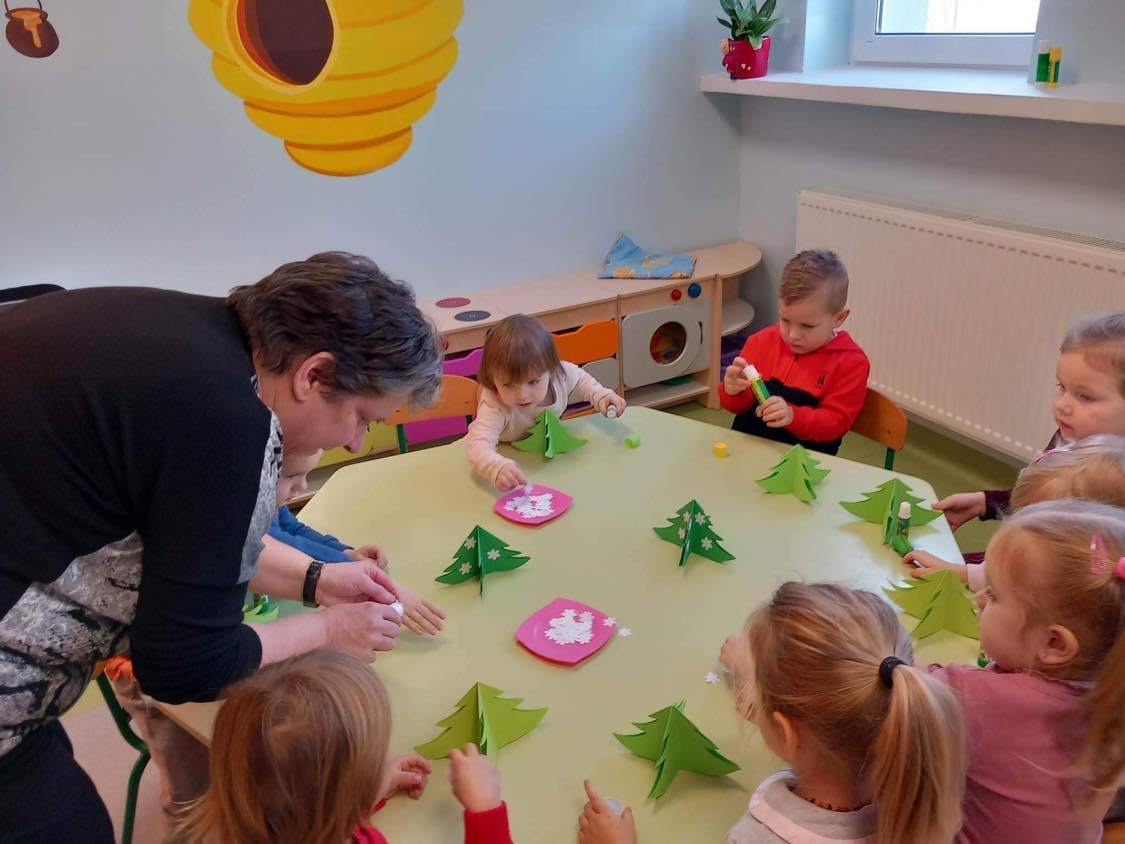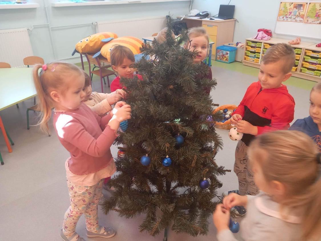 W poniedziałek najmłodsza grupa w przedszkolu obchodziła Dzień Choinki. Dzieci w trakcie zajęć poznały tradycję ubierania choinki, wypowiadały się na temat historyjki obrazkowej pt: Wyprawa po choinkę; rozmawiały o przygotowaniach do świąt w swoich domach. Najwięcej radości sprawiło im samodzielne udekorowanie choinki, która wprowadziła wszystkich w radosny nastrój oczekiwania na Święta Bożego Narodzenia.