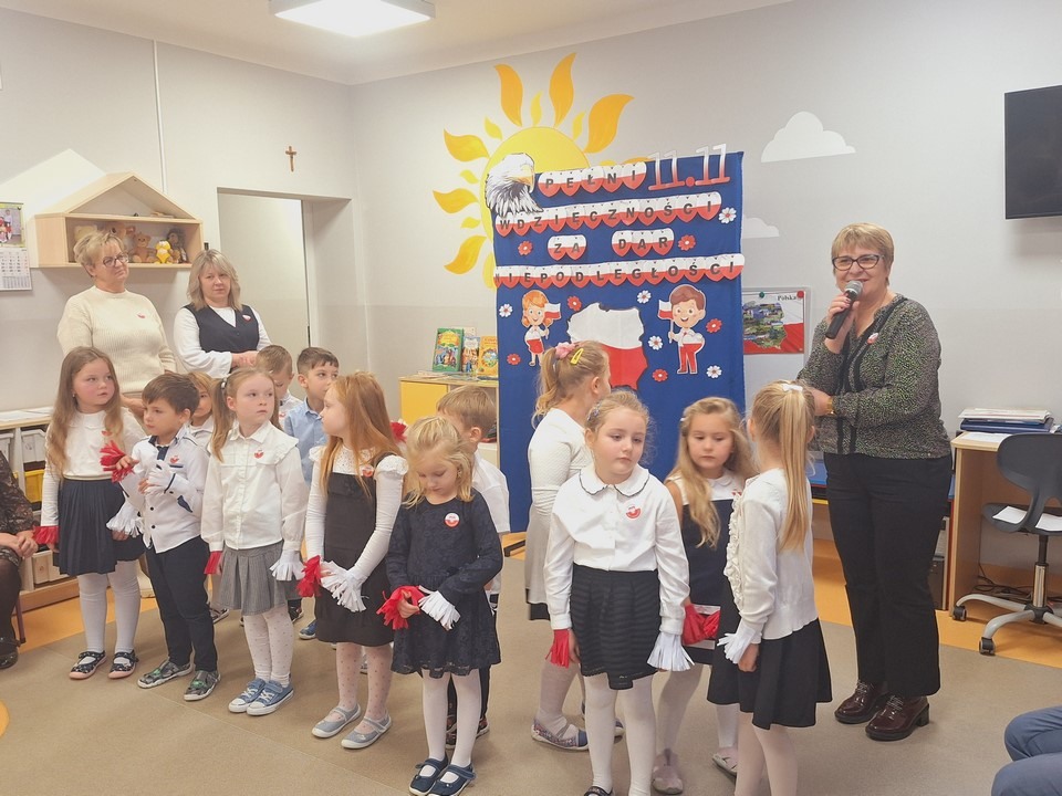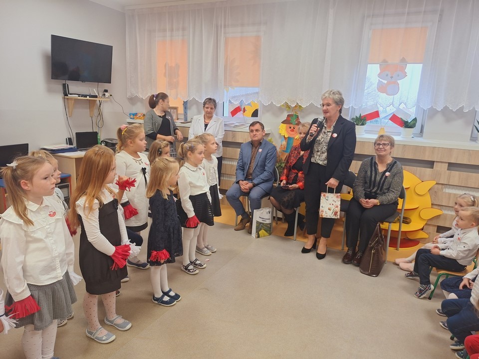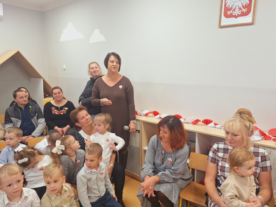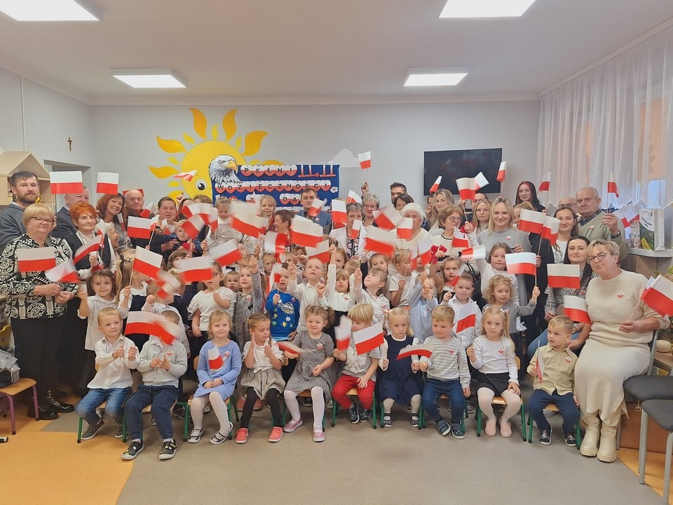 W dniu 8 listopada w naszym przedszkolu obchodziliśmy Narodowe Święto Niepodległości. Z tej okazji dzieci z wszystkich grup, nauczyciele pracownicy przedszkola oraz zaproszeni goście ; Wójt Gminy Wietrzychowice – Robert Śpiewak , Przewodnicząca Rady Gminy – Dorota Stokłosa ,Dyrektor GCK – Jadwiga Gorla , Dyrektor ZSP -Jadwiga Łucarz członkowie Klubu Seniora Radosna Przystań i Wesoła Ferajna, rodzice dzieci najstarszej grupy zebrali się, aby uroczyście świętować ten wyjątkowy dla Polaków czas.Swoją obecnością zaszczyciła nas Pani Marzena Kozłowska , która kiedyś pracowała w naszym przedszkolu. Wszyscy z powagą i w dużym skupieniu oglądali program artystyczny przygotowany przez dzieci z grupy Mądrych sów. Podczas występu dzieci recytowały wiersze patriotyczne, śpiewały piosenki, tańczyły. Występy przedszkolaków, ich przygotowanie, zaangażowanie, postawa patriotyczna i artystyczny talent nagrodzony został gromkimi brawami. Uroczystość zakończyła się wspólnym śpiewaniem pieśni patriotycznych, oraz słodkim poczęstunkiem przygotowanym przez nasze kucharki. Dzień Niepodległości stał się bardzo radosnym dniem w naszym przedszkolu .Dzięki udziałowi w tego typu uroczystościach przedszkolaki od najmłodszych lat uczą się patriotyzmu,przywiązania do kraju ojczystego, jego kultury i tradycji oraz poszanowania symboli narodowych . Bardzo dziękuję wszystkim , którzy przyczynili się do obchodów tak ważnego dla wszystkich Polaków święta.