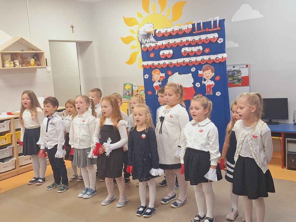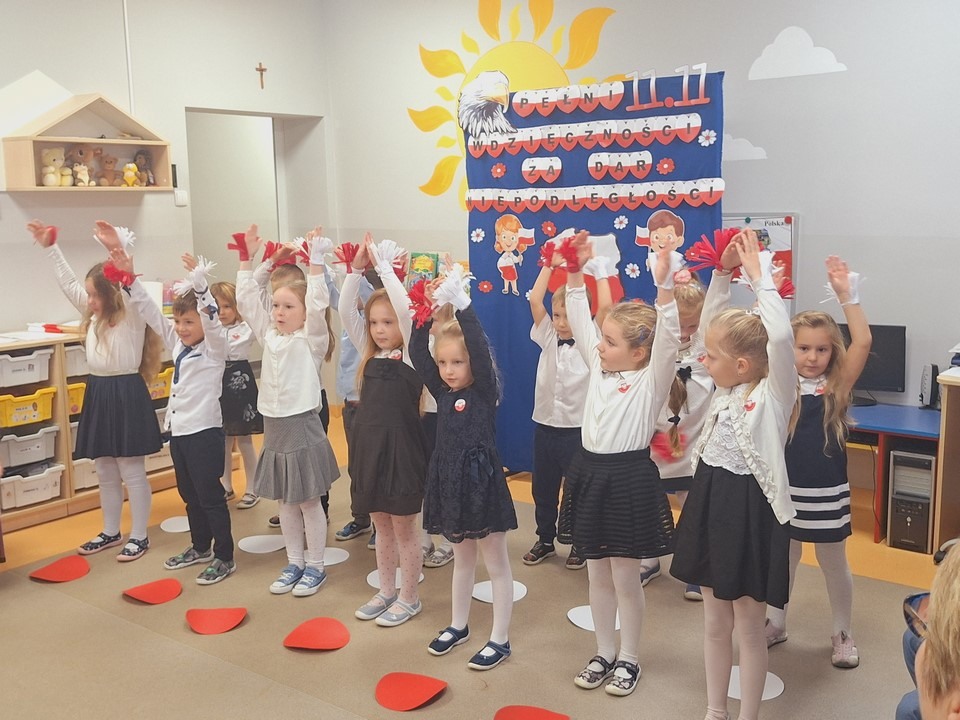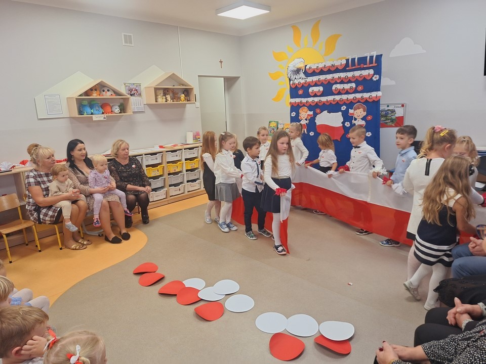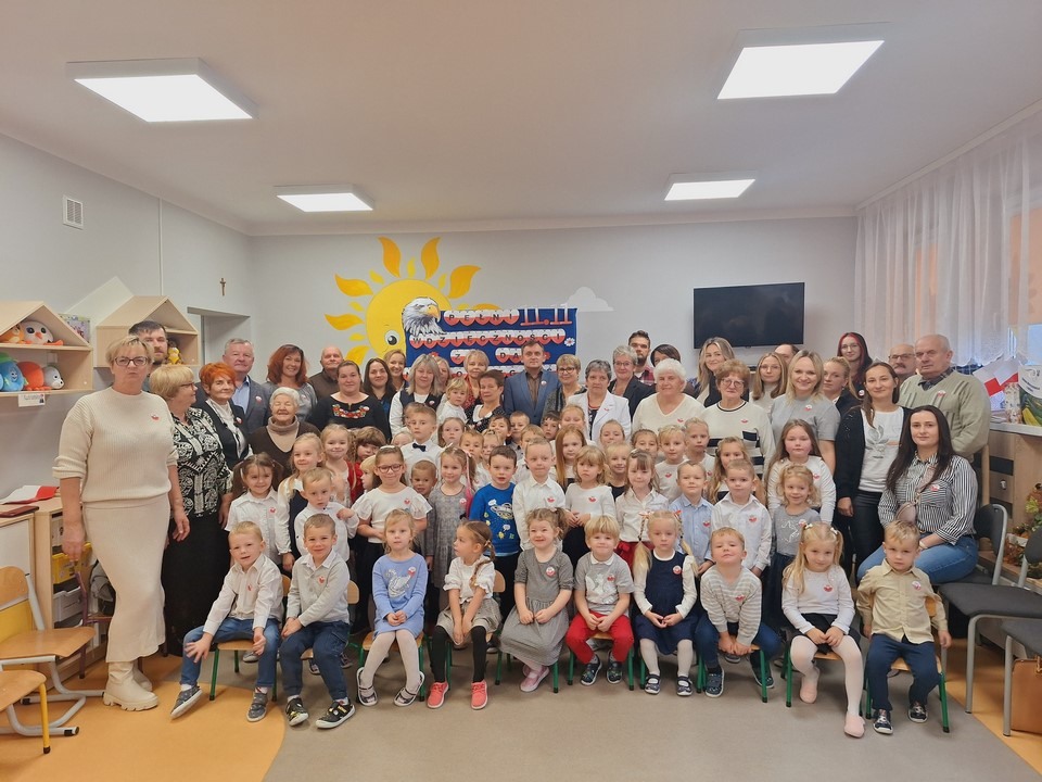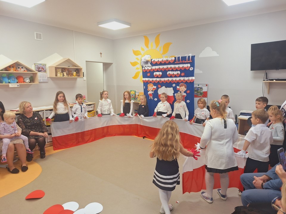 W dniu 8 listopada w naszym przedszkolu obchodziliśmy Narodowe Święto Niepodległości. Z tej okazji dzieci z wszystkich grup, nauczyciele pracownicy przedszkola oraz zaproszeni goście ; Wójt Gminy Wietrzychowice – Robert Śpiewak , Przewodnicząca Rady Gminy – Dorota Stokłosa ,Dyrektor GCK – Jadwiga Gorla , Dyrektor ZSP -Jadwiga Łucarz członkowie Klubu Seniora Radosna Przystań i Wesoła Ferajna, rodzice dzieci najstarszej grupy zebrali się, aby uroczyście świętować ten wyjątkowy dla Polaków czas.Swoją obecnością zaszczyciła nas Pani Marzena Kozłowska , która kiedyś pracowała w naszym przedszkolu. Wszyscy z powagą i w dużym skupieniu oglądali program artystyczny przygotowany przez dzieci z grupy Mądrych sów. Podczas występu dzieci recytowały wiersze patriotyczne, śpiewały piosenki, tańczyły. Występy przedszkolaków, ich przygotowanie, zaangażowanie, postawa patriotyczna i artystyczny talent nagrodzony został gromkimi brawami. Uroczystość zakończyła się wspólnym śpiewaniem pieśni patriotycznych, oraz słodkim poczęstunkiem przygotowanym przez nasze kucharki. Dzień Niepodległości stał się bardzo radosnym dniem w naszym przedszkolu .Dzięki udziałowi w tego typu uroczystościach przedszkolaki od najmłodszych lat uczą się patriotyzmu,przywiązania do kraju ojczystego, jego kultury i tradycji oraz poszanowania symboli narodowych . Bardzo dziękuję wszystkim , którzy przyczynili się do obchodów tak ważnego dla wszystkich Polaków święta.