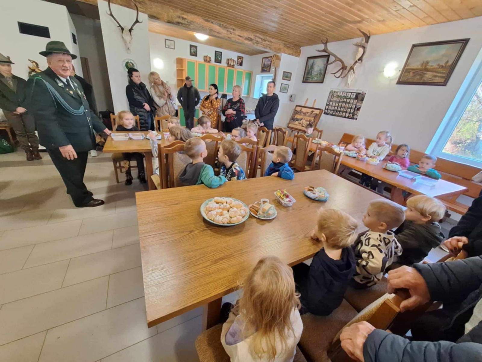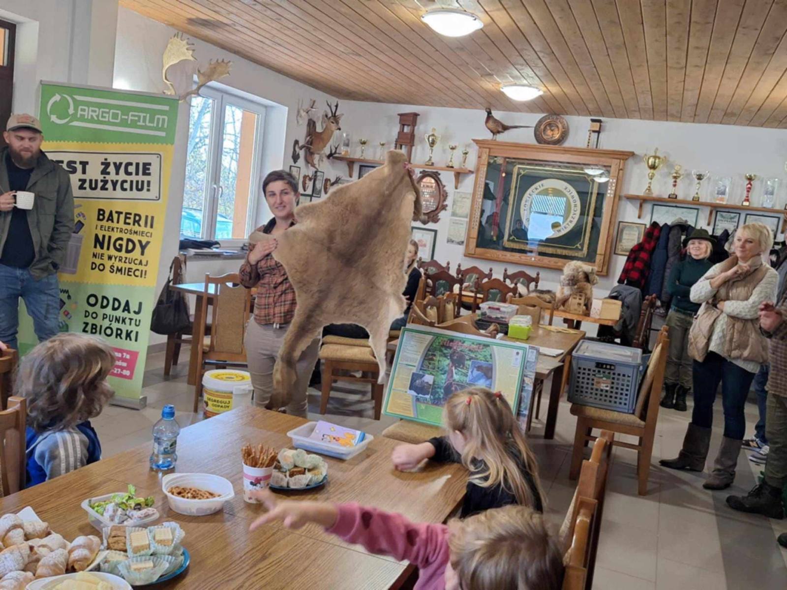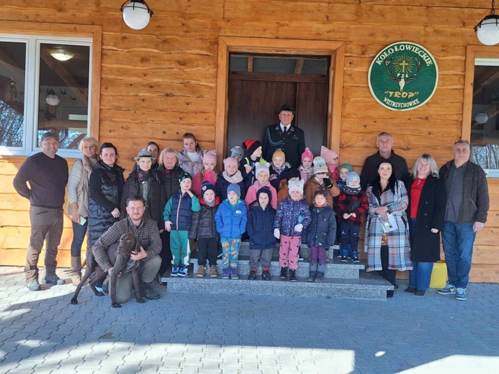 W dniu 6 listopada z inicjatywy Rodziców z grupy „Promyczki” Przedszkola Publicznego w Wietrzychowicach dzieci wraz z opiekunami odbyły niecodzienną wycieczkę do Domu Myśliwych w Dębowych Domach. Wnętrze domku zachwyciło wszystkich pięknym wystrojem; ściany ozdobione porożami zwierząt, ciepło płonącego drewna w kominku. Na nasz przyjazd oczekiwał łowczy pan Marcin Gwóźdź ze swoim wiernym towarzyszem psem Aresem. Prezes Koła Łowieckiegi „Trop” w swoim odświętnym stroju rozpoczął spotkanie tradycyjnym myśliwskim pozdrowieniem „Darz Bór”. Wyjaśnił dzieciom znaczenie tych słów oraz poinformował czym zajmują się myśliwi. Z kolei głos zabrała pani Agata Damska-Guła. Opowiedziała krótko historię myślistwa, którą dzieci z zainteresowaniem wysłuchały. Następnie pani z Zarządu Okręgowego Polskiego Związku Łowiectwa w Tarnowie prezentując tablice edukacyjne przeprowadziła w ciekawy sposób pogadankę na temat najpopuparniejszych leśnych zwierząt, ich zwyczajach, sposobach odżywiania. Korzystając z tablicy interaktywnej dzieci rozróżniały wydawane przez nie odgłosy. Przedszkolaki żywo reagowały w czasie pogadanki, dzieliły się swoimi spostrzeżeniami. Wykazały się dużą wiedzą w tym zakresie, z czego wychowawczyni i obecni Rodzice byli bardzo dumni. Dzieci miały okazję dotknąć skóry z kangura, renifera, a także założyć na głowę czapkę z lisa lub wilka. Mogły również sprawdzić,jak ciężkie są łopaty łosia i dotknąć parostki kozła sarny. Dzięki prelekcji zaprezentowanej pzez panie z firmy Agro-Film dzieci zostały poinformowane , jak należy postępować ze zużytymi bateriami. Nasze przedszkole przekazało zebrane dotychczas baterie i zadeklarowało dalszą współpracę. Dyrektor firmy Agro-Film Tomasz Wcisło wręczył pani dyrektor bon w wysokosci 500zł na zakup pomocy dydaktycznych dla dzieci z grupy „Promyczki”. Po części oficjalnej czekał na nas poczęstunek. Najpierw smaczne kiełbaski, a później przepyszne rogaliki, ciasteczka, paluszki, cukierki, soki. Na zakończenie spotkania dzieci otrzymały upominki, a myśliwym -na ręce pana prezesa – wręczyły laurkę na pamiątkę tego wspaniałego spotkania. Z tego wyjątkowego dnia pozostaną nam zdjęcia oraz ogrom wrażeń. Serdeczne podziękowania dla: – Prezesa Koła Łowieckiego pana Wojciecha Gwoździa z małżonką Celiną. – Łowczego pana Marcina Gwoździa i 2 członków: pana Marka Maniochy i pana Arkadiusza Urbana. – Dyrektora firmy Agro-Film pana Tomasza Wcisło oraz pań: Nikoletty Wcisło i Marzeny Kierczak. – Pani Gabrieli Mach Soji z Zarządu Okręgowego Polskiego Związku Łowieckiego w Tarnowie – Pani Renacie Maniocha – Obecnym rodzicom na czele z panią Agatą Damską-Gułą.