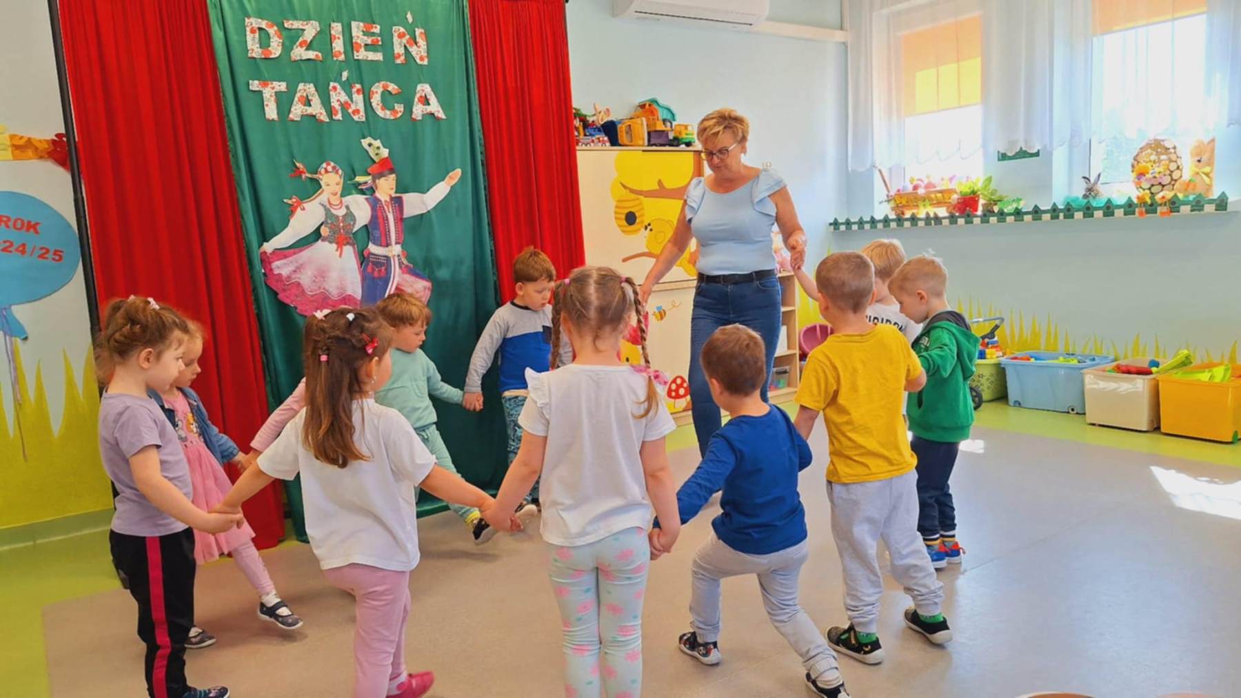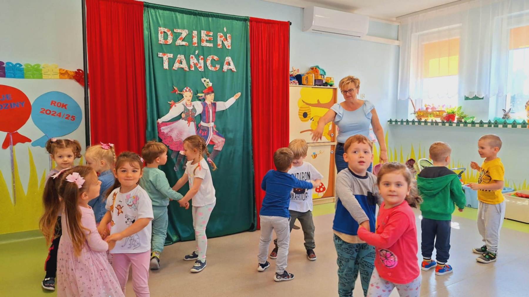 Dzień Tańca w przedszkolu to prawdziwe święto ruchu, radości i wyrażanie emocji przez ciało. Taniec nie tylko sprawia dzieciom ogromną frajdę, ale również rozwija koordynację ruchową, wrażliwość muzyczną i pewność siebie. To doskonała okazja, by pokazać maluchom, że ruch może być formą zabawy, relaksu i komunikacji. Ten dzień w grupie Pszczółek był radosny, kolorowy i pełen energii. Dzieci poznały różne tańce, poznały podstawowe kroki krakowiaka oraz strój krakowski.