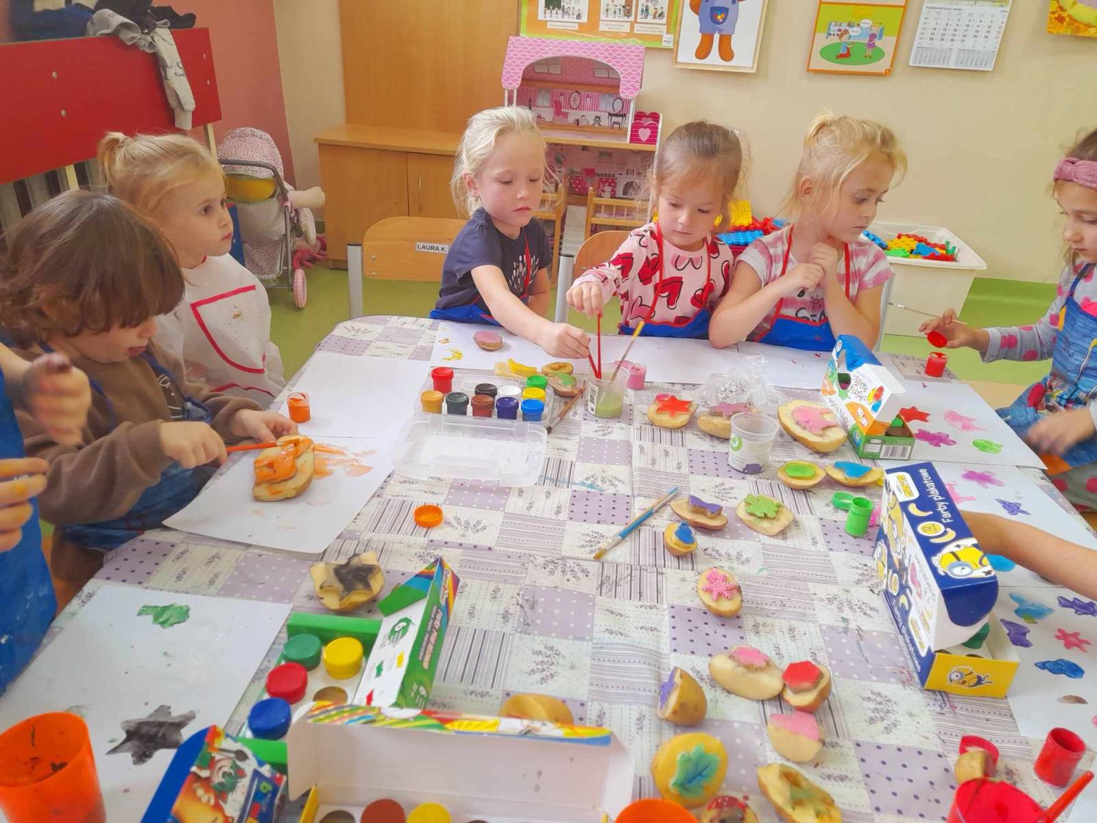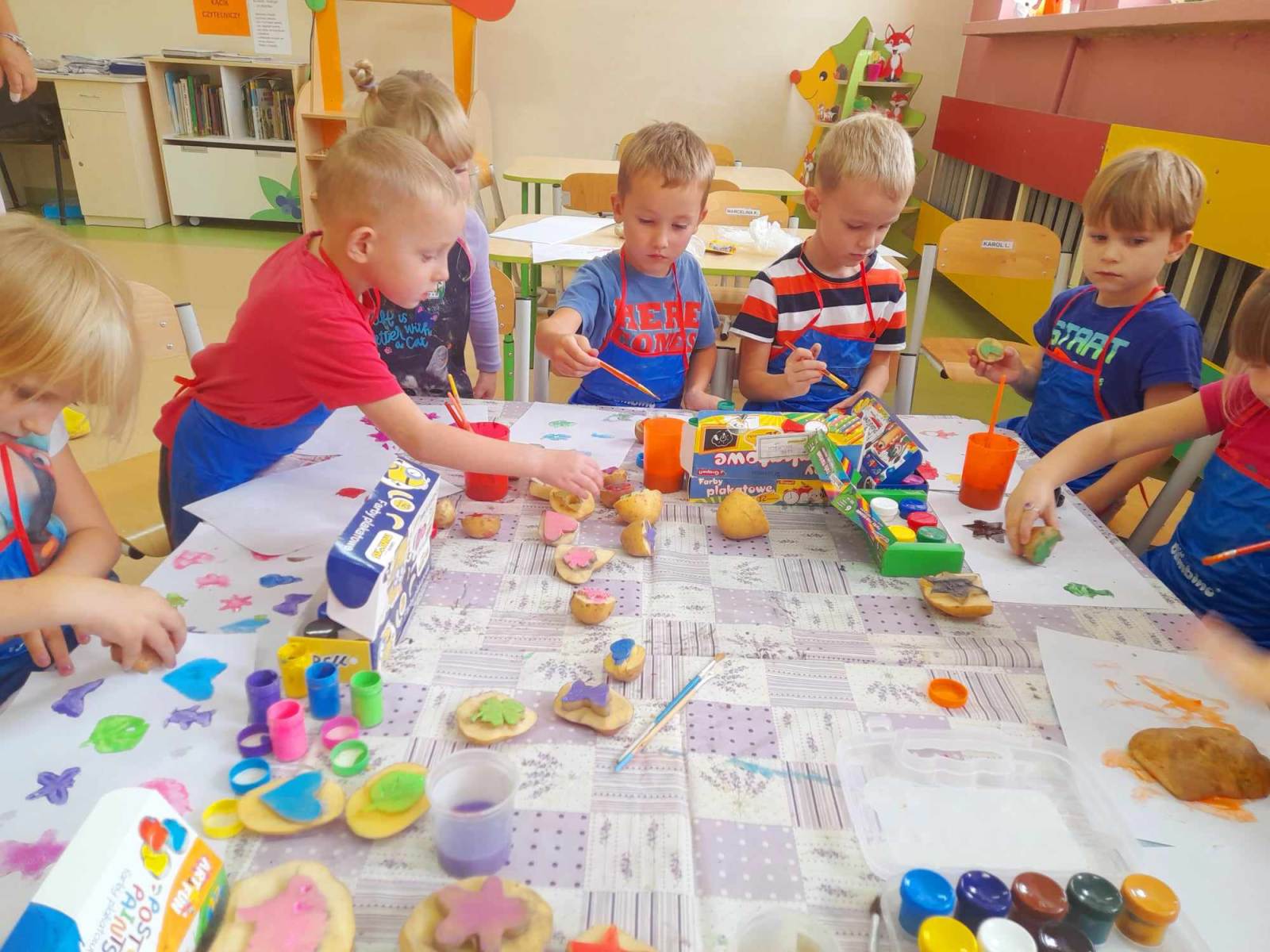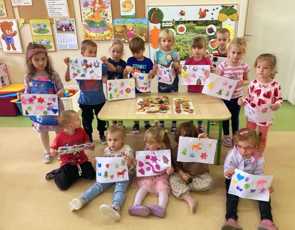 W piątek Misie obchodziły Dzień Ziemniaka. Podczas zajęć dzieci wzbogaciły swoje wiadomości dotyczące pochodzenia ziemniaka, poznały produkty i potrawy wykonywane z ziemniaków. Podczas zabaw i konkurencji z użyciem ziemniaków wdrażano dzieci do przestrzegania określonych zasad i reguł, rozwijano umiejętności czerpania radości i przyjemności ze wspólnej zabawy. Na zakończenie zajęć dzieci malowały farbami stemple wykonane z ziemniaków, które przygotowały wspólnie z rodzicami w domu. Powstały ciekawe, kolorowe prace.