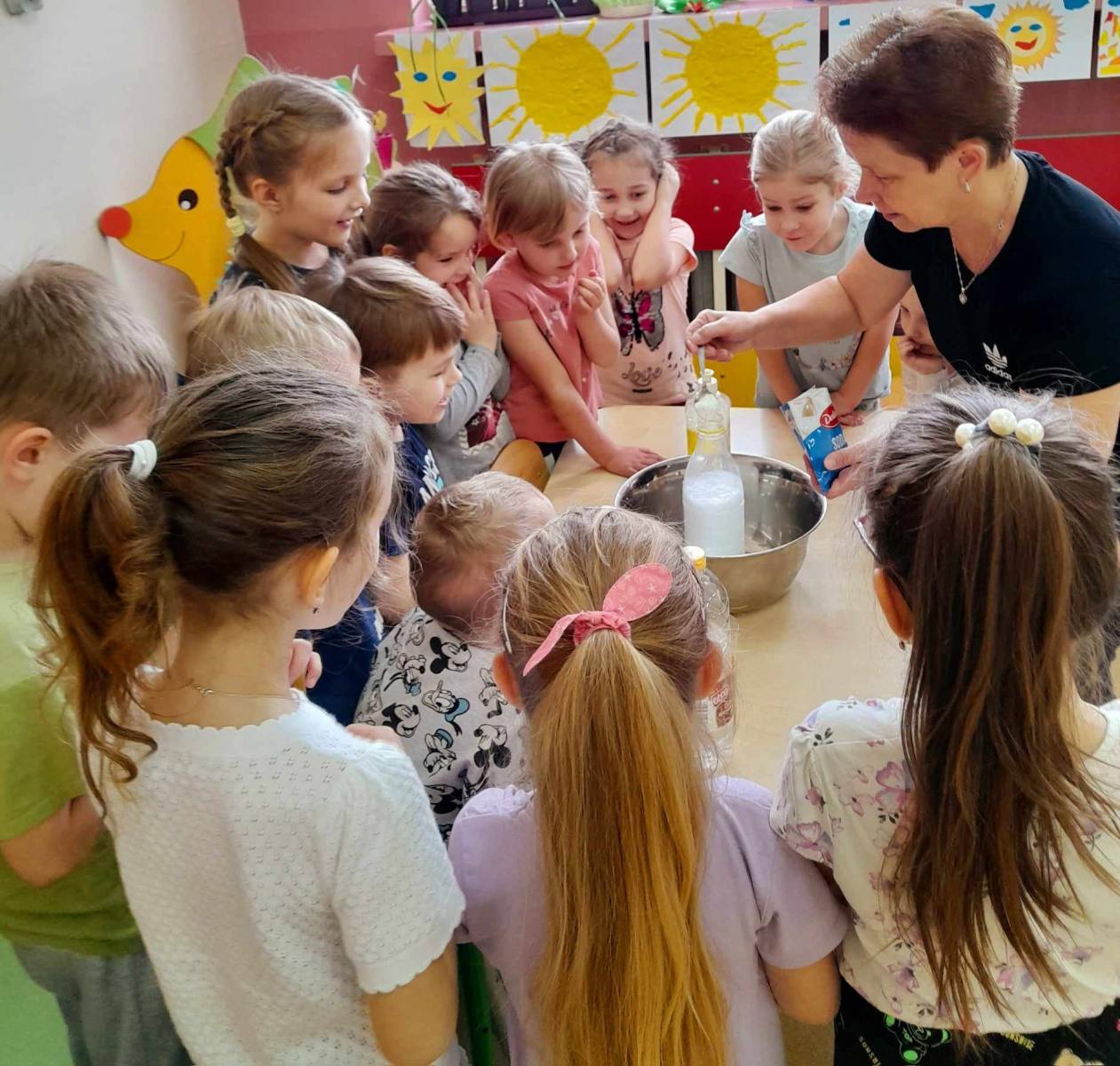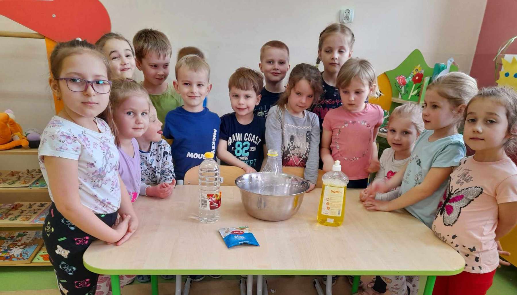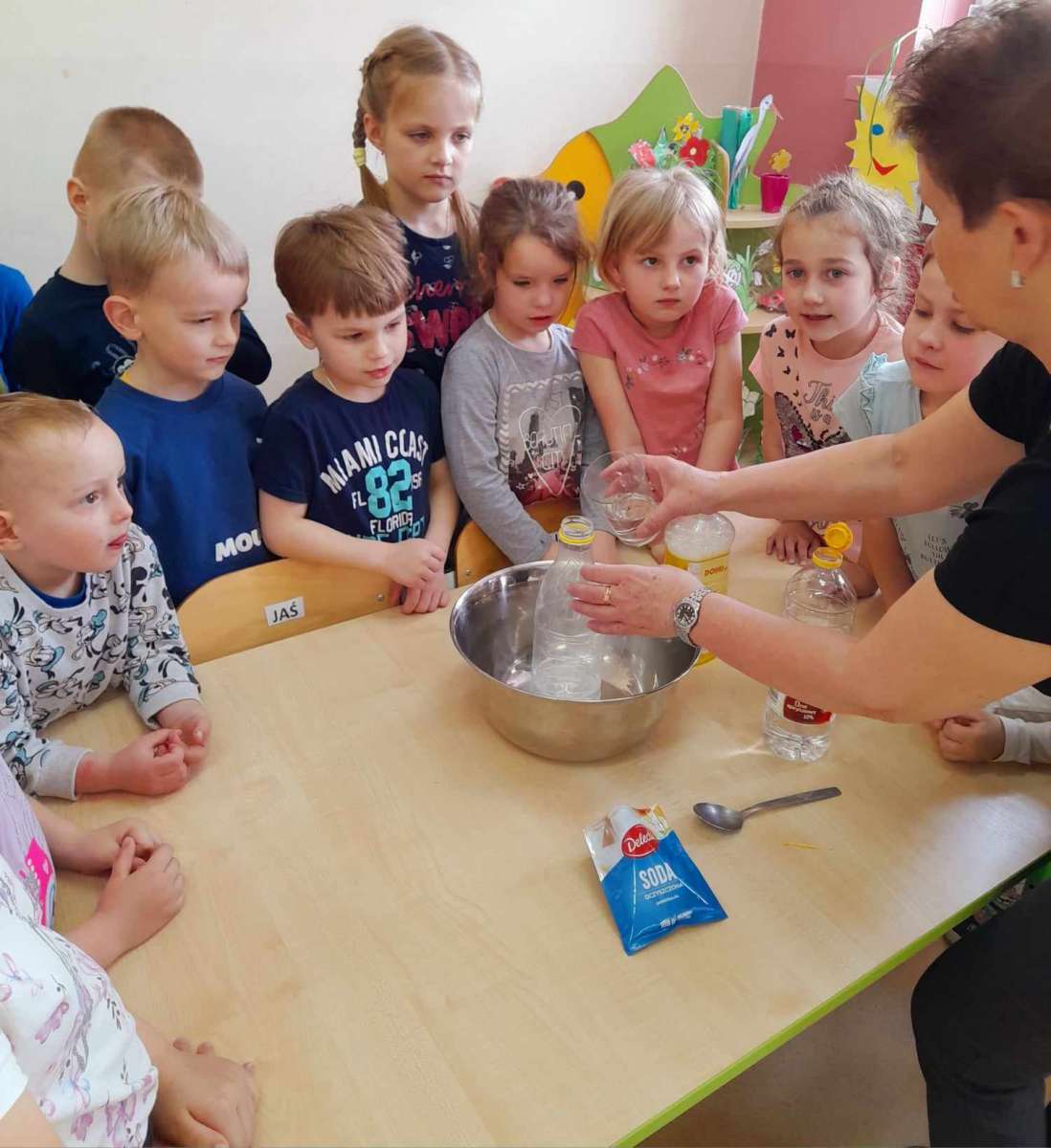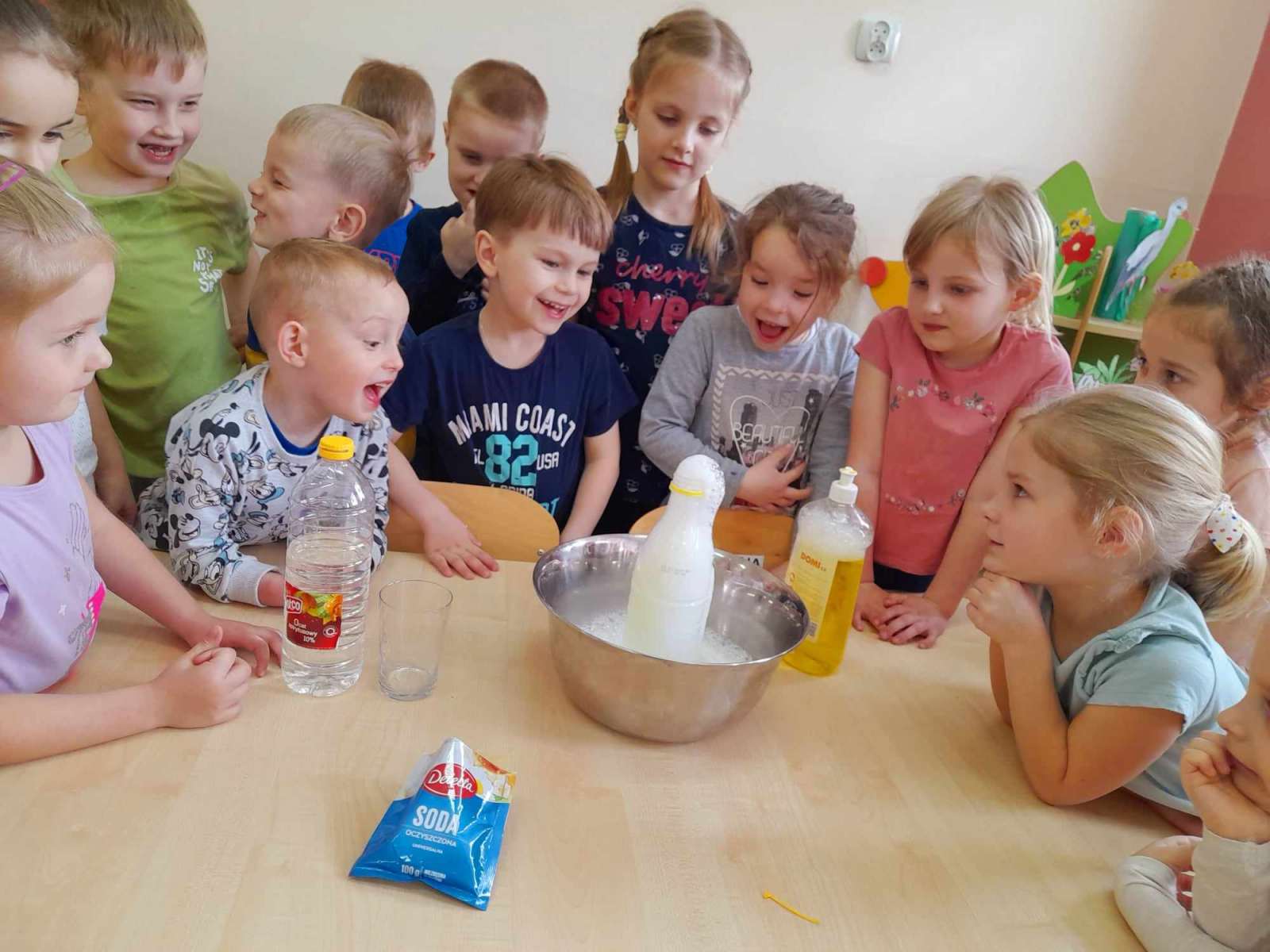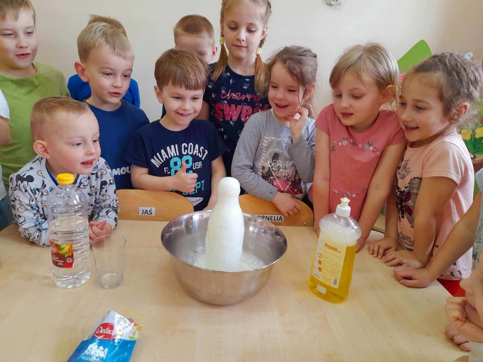 Wulkan to „dziura” w ziemi z której wydobywa się gorąca ciecz. Misie wykonywały na zajęciach eksperyment w wyniku którego mogły obserwować jak powstaje wulkan. Do butelki wlały ocet, dosypały sody oczyszczonej i płyń do naczyń. Nasz wulkan wybuchł, a lawa wypływała z butelki. Dzięki takim zajęciom dzieci doskonaliły umiejętność wyciągania wniosków, zdobyły nową wiedzę poszerzyły zasób słownictwa.