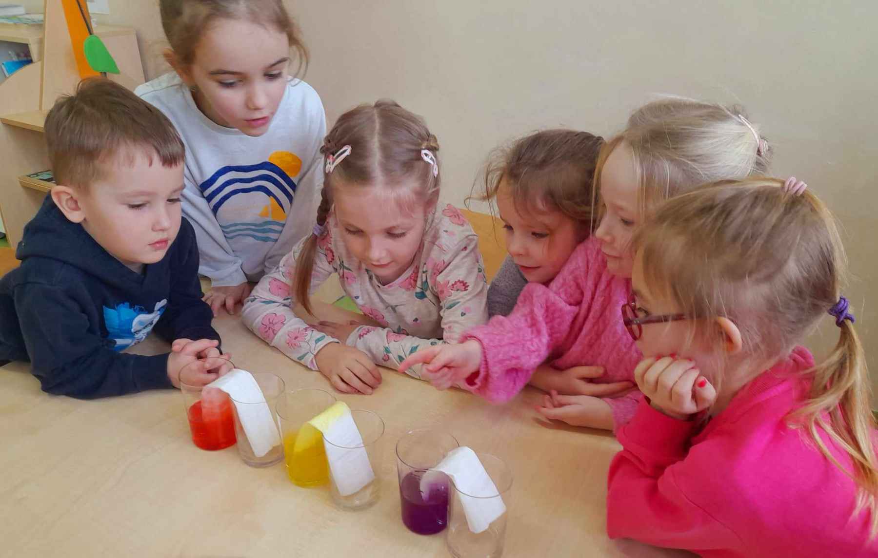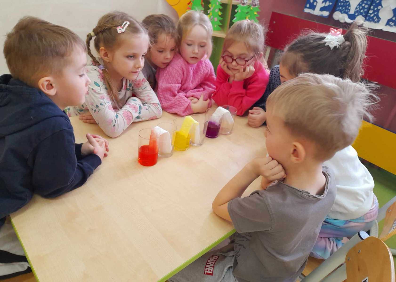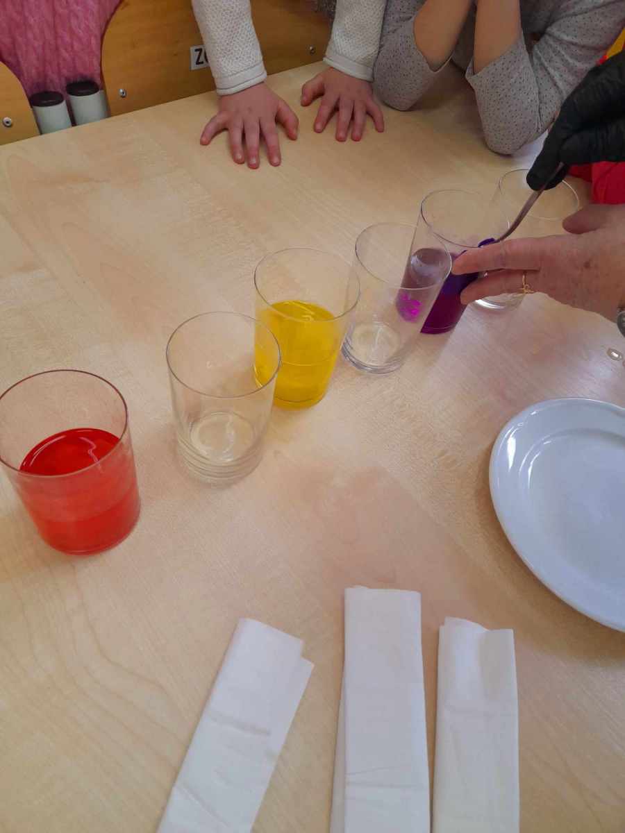 „Wędrującą woda” – Misie przeprowadziły eksperyment z wędrującą wodą po papierowych ręcznikach. Było to dla dzieci ciekawe doświadczenie wymagające cierpliwości. Do zabawy przygotowaliśmy 6 szklanek. Do co drugiej wlaliśmy wodę, zabarwiliśmy bibułą, włożyliśmy do wody złożone w paski papierowe ręczniki. Przez resztę dnia obserwowaliśmy co się będzie działo. Dzieci były zachwycone eksperymentem.