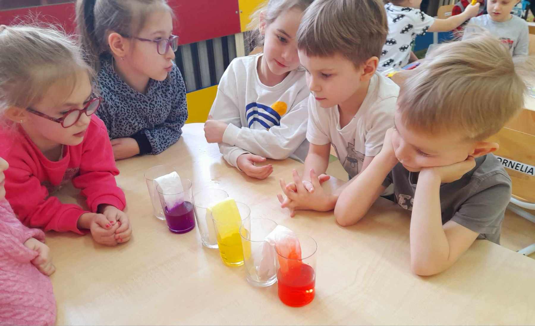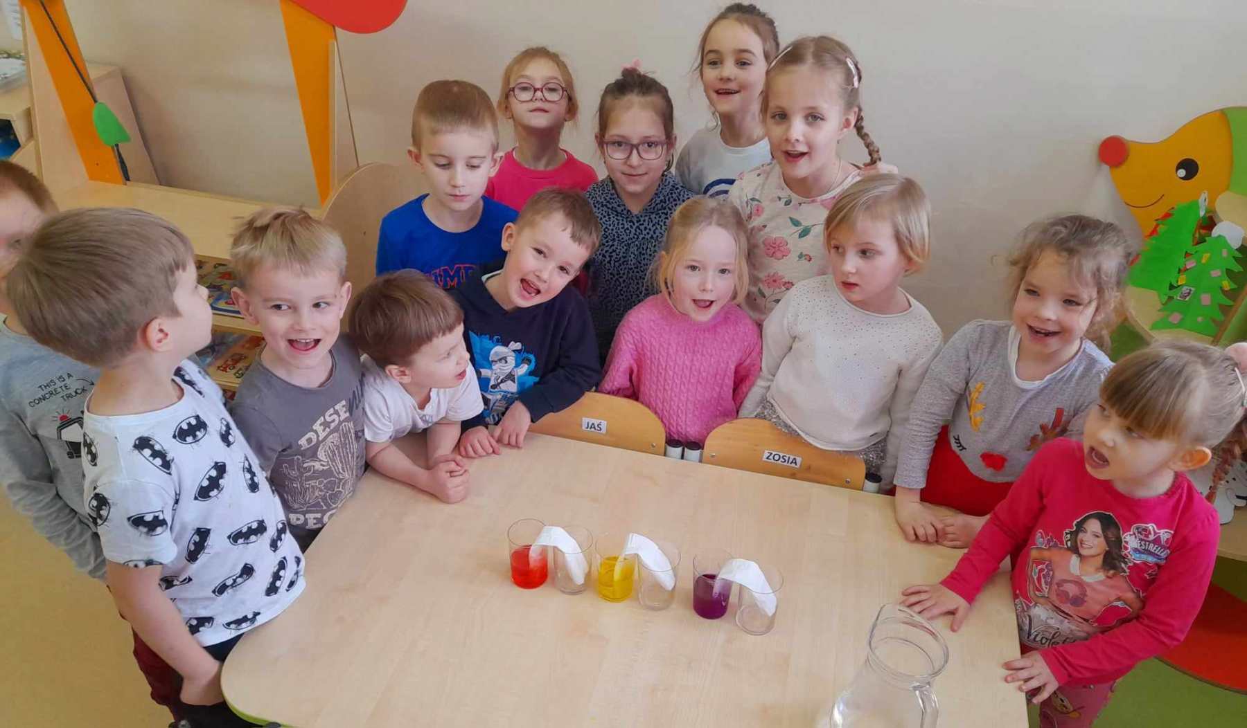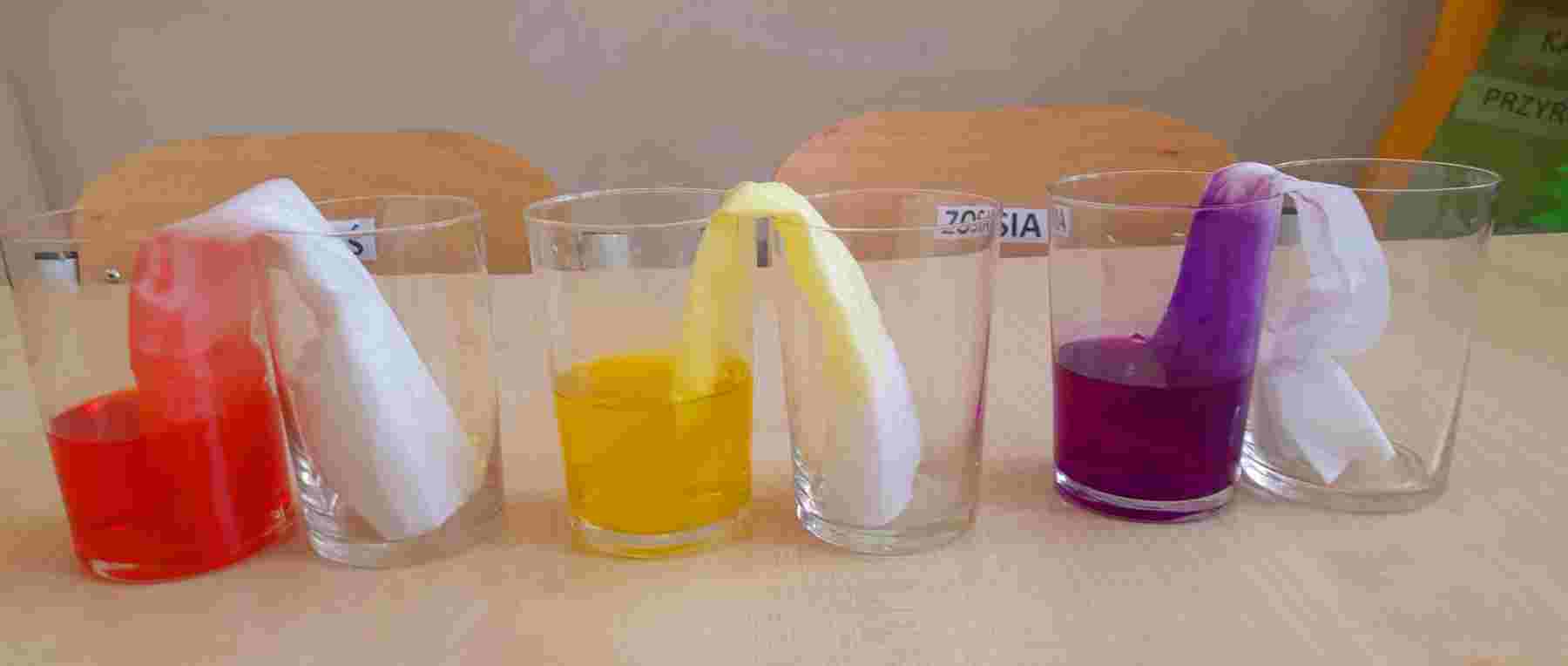 „Wędrującą woda” – Misie przeprowadziły eksperyment z wędrującą wodą po papierowych ręcznikach. Było to dla dzieci ciekawe doświadczenie wymagające cierpliwości. Do zabawy przygotowaliśmy 6 szklanek. Do co drugiej wlaliśmy wodę, zabarwiliśmy bibułą, włożyliśmy do wody złożone w paski papierowe ręczniki. Przez resztę dnia obserwowaliśmy co się będzie działo. Dzieci były zachwycone eksperymentem.