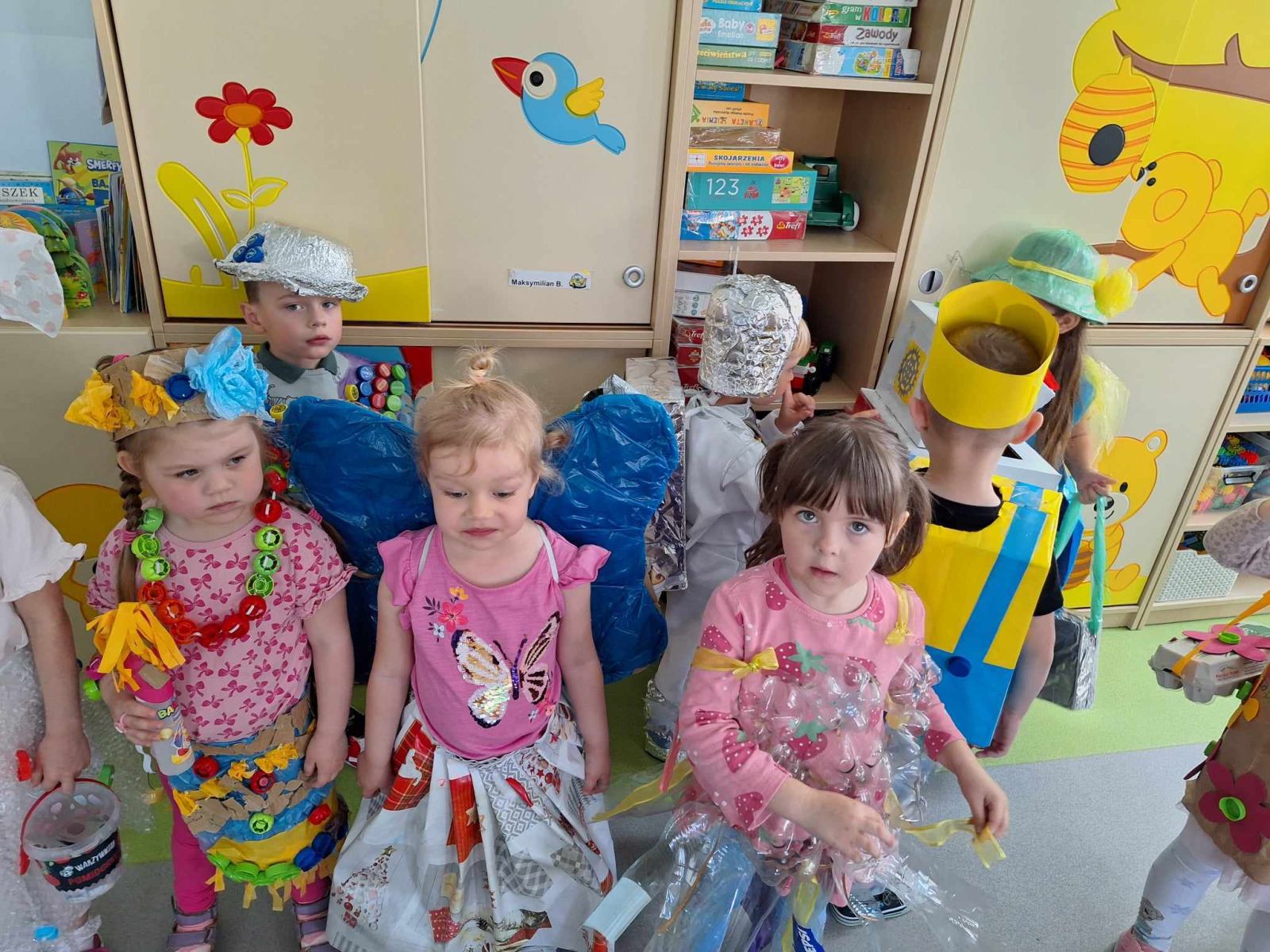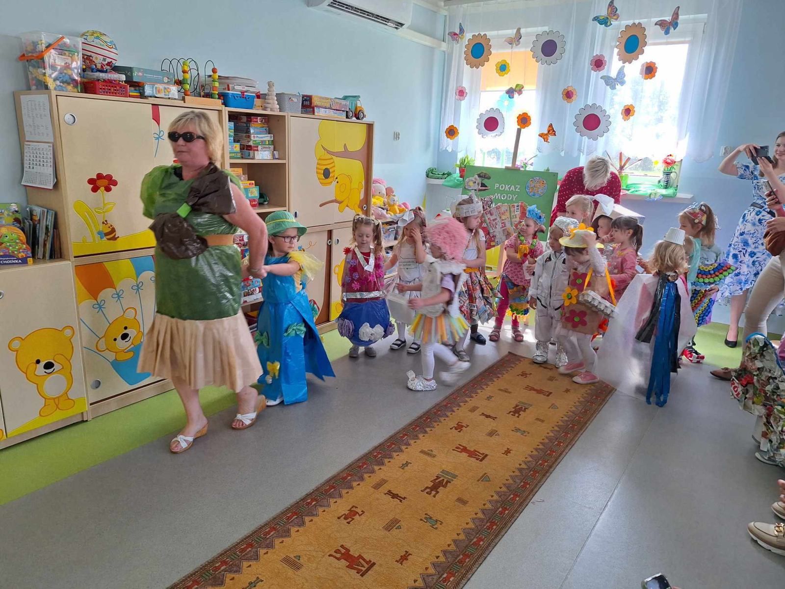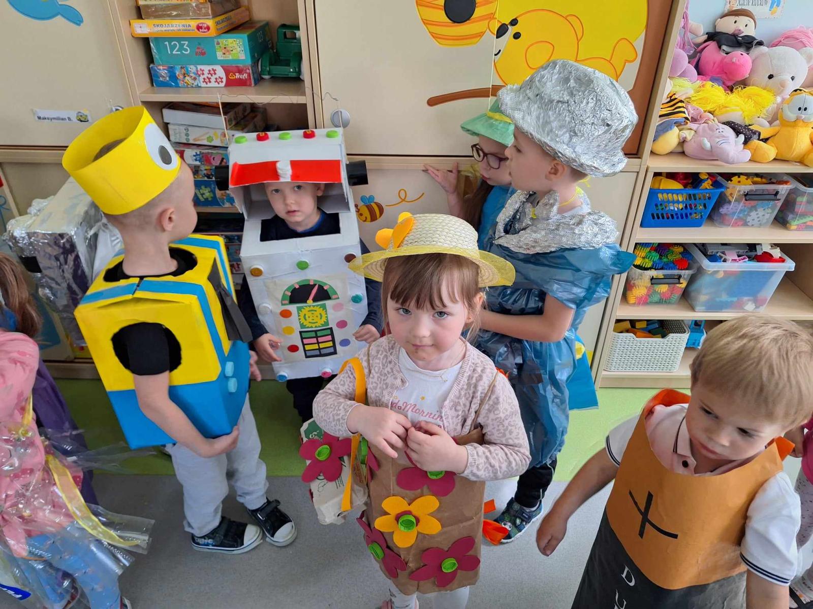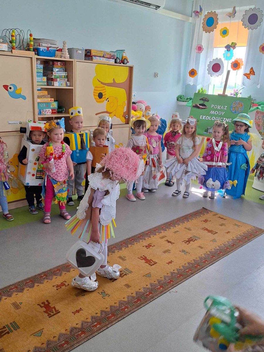 W piątek 10 maja w grupie Pszczółek odbył się niezwykły Pokaz Mody Ekologicznej, który cieszył oczy wszystkich obecnych w sali. Był on zwieńczeniem działań projektu edukacyjnego „Dzieci kontra śmieci”, realizowanego w grupie maluchów w tym tygodniu. Pokaz poprzedził quiz o tematyce ekologicznej, podczas którego dzieci wykazały się bardzo dobrą znajomością wiedzy na temat ochrony środowiska i dbania o naszą planetę Ziemię. Wszystkie zaprezentowane podczas pokazu kreacje, zarówno pań jak i dzieci, wykonane zostały z różnorodnych materiałów przeznaczonych do recyklingu, m.in. kartonów, worków, folii, gazet, plastikowych butelek, zakrętek. Dzieci doskonale sprawdziły się w roli modelek i modeli. Z dumą i radością, ale również dziecięcą gracją prezentowały swoje wyjątkowe, oryginalne, jedyne w swoim rodzaju stroje na ” czerwonym dywanie”. Na zakończenie pokazu dzieci otrzymały pamiątkowe dyplomy I upominki z rąk obecnej z nami pani dyrektor ZSP Jadwgi Łucarz. Składam serdeczne podziękowania wszystkim Rodzicom, którzy wspólnie z dziećmi przygotowali przepiękne kreacje. Jestem pełna podziwu dla pomysłowości, kreatywności, zaangażowania. a także zainteresowania naszymi działaniami. Bardzo dziękuję za liczny udział w zajęciach otwartych i poświęcony czas.