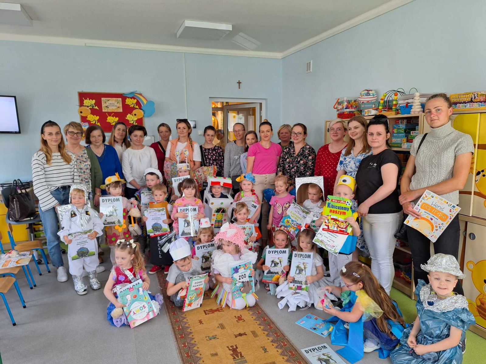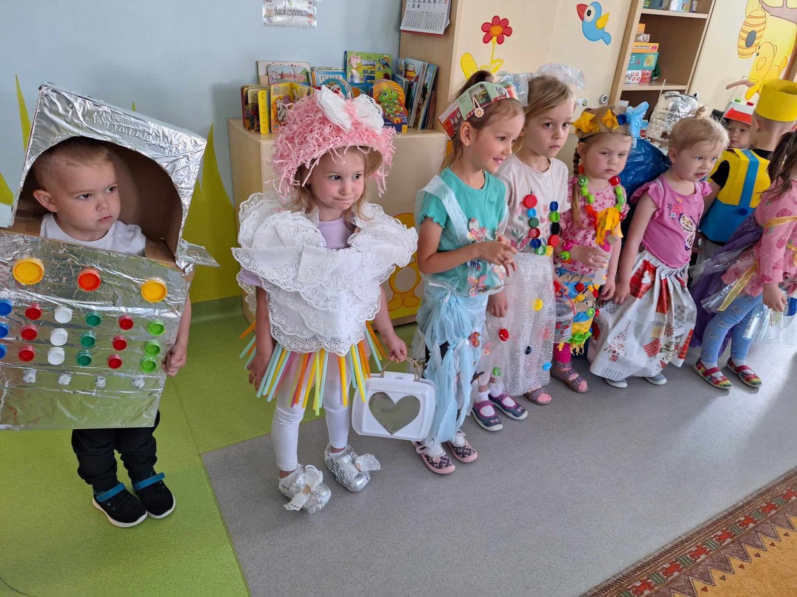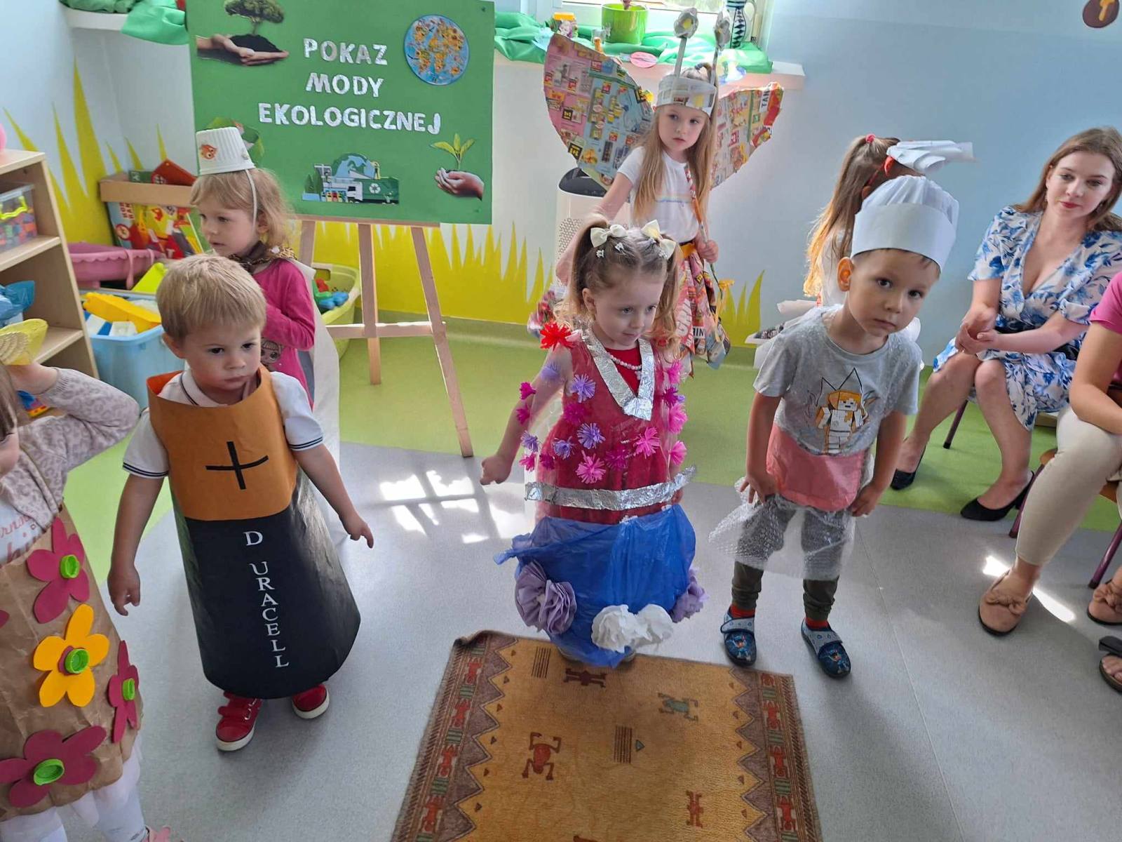 W piątek 10 maja w grupie Pszczółek odbył się niezwykły Pokaz Mody Ekologicznej, który cieszył oczy wszystkich obecnych w sali. Był on zwieńczeniem działań projektu edukacyjnego „Dzieci kontra śmieci”, realizowanego w grupie maluchów w tym tygodniu. Pokaz poprzedził quiz o tematyce ekologicznej, podczas którego dzieci wykazały się bardzo dobrą znajomością wiedzy na temat ochrony środowiska i dbania o naszą planetę Ziemię. Wszystkie zaprezentowane podczas pokazu kreacje, zarówno pań jak i dzieci, wykonane zostały z różnorodnych materiałów przeznaczonych do recyklingu, m.in. kartonów, worków, folii, gazet, plastikowych butelek, zakrętek. Dzieci doskonale sprawdziły się w roli modelek i modeli. Z dumą i radością, ale również dziecięcą gracją prezentowały swoje wyjątkowe, oryginalne, jedyne w swoim rodzaju stroje na ” czerwonym dywanie”. Na zakończenie pokazu dzieci otrzymały pamiątkowe dyplomy I upominki z rąk obecnej z nami pani dyrektor ZSP Jadwgi Łucarz. Składam serdeczne podziękowania wszystkim Rodzicom, którzy wspólnie z dziećmi przygotowali przepiękne kreacje. Jestem pełna podziwu dla pomysłowości, kreatywności, zaangażowania. a także zainteresowania naszymi działaniami. Bardzo dziękuję za liczny udział w zajęciach otwartych i poświęcony czas.