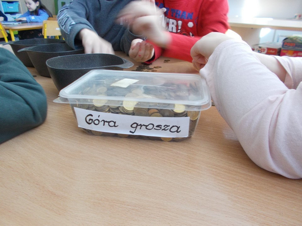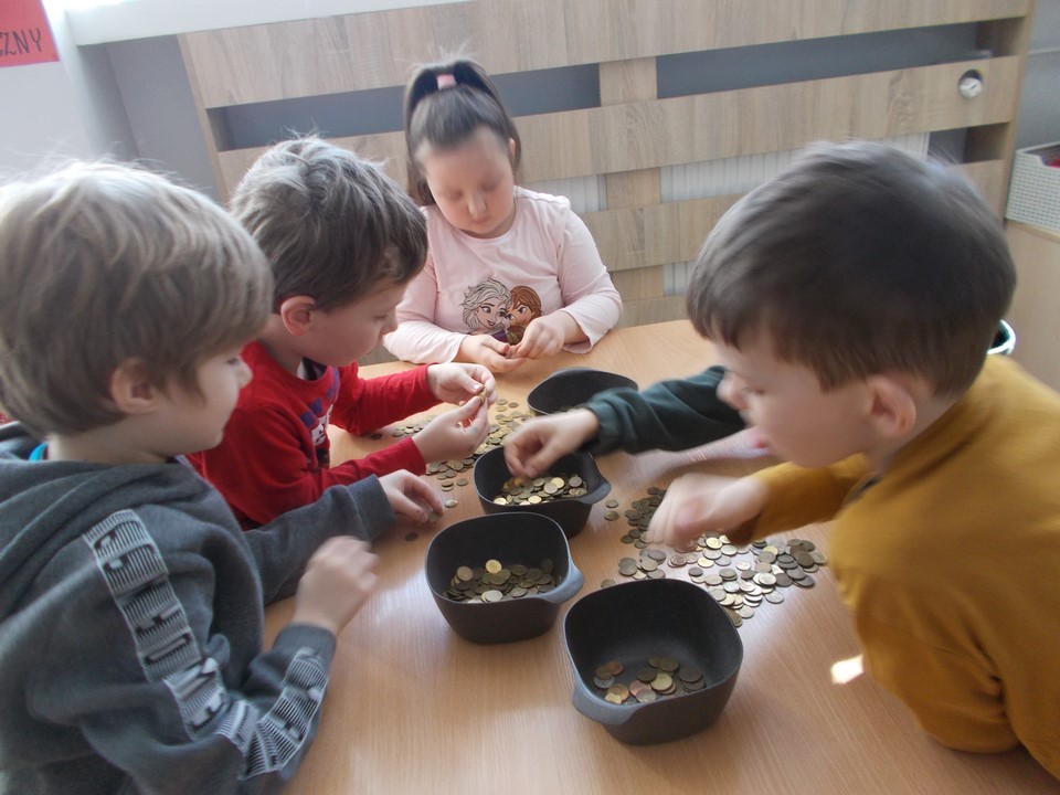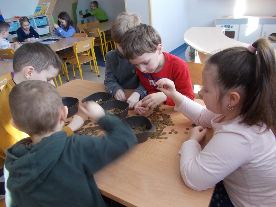 Sprawnie i szybko posegregowali monety ze zbiórki ,, Góry grosza’’ wg ich nominałów. Podobnie jak w latach poprzednich, tak i w tym roku nasze przedszkole zbierało grosze w ramach akcji organizowanej przez Towarzystwo Nasz Dom. Celem jej jest zebranie funduszy na pomoc psychologiczną, rzeczową i specjalistyczną dla dzieci ( w szczególności wychowujących się poza własnym środowiskiem rodzinnym) i rodzin. Dziękujemy rodzicom za wsparcie tej akcji.