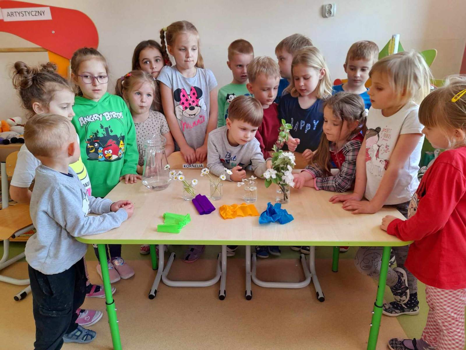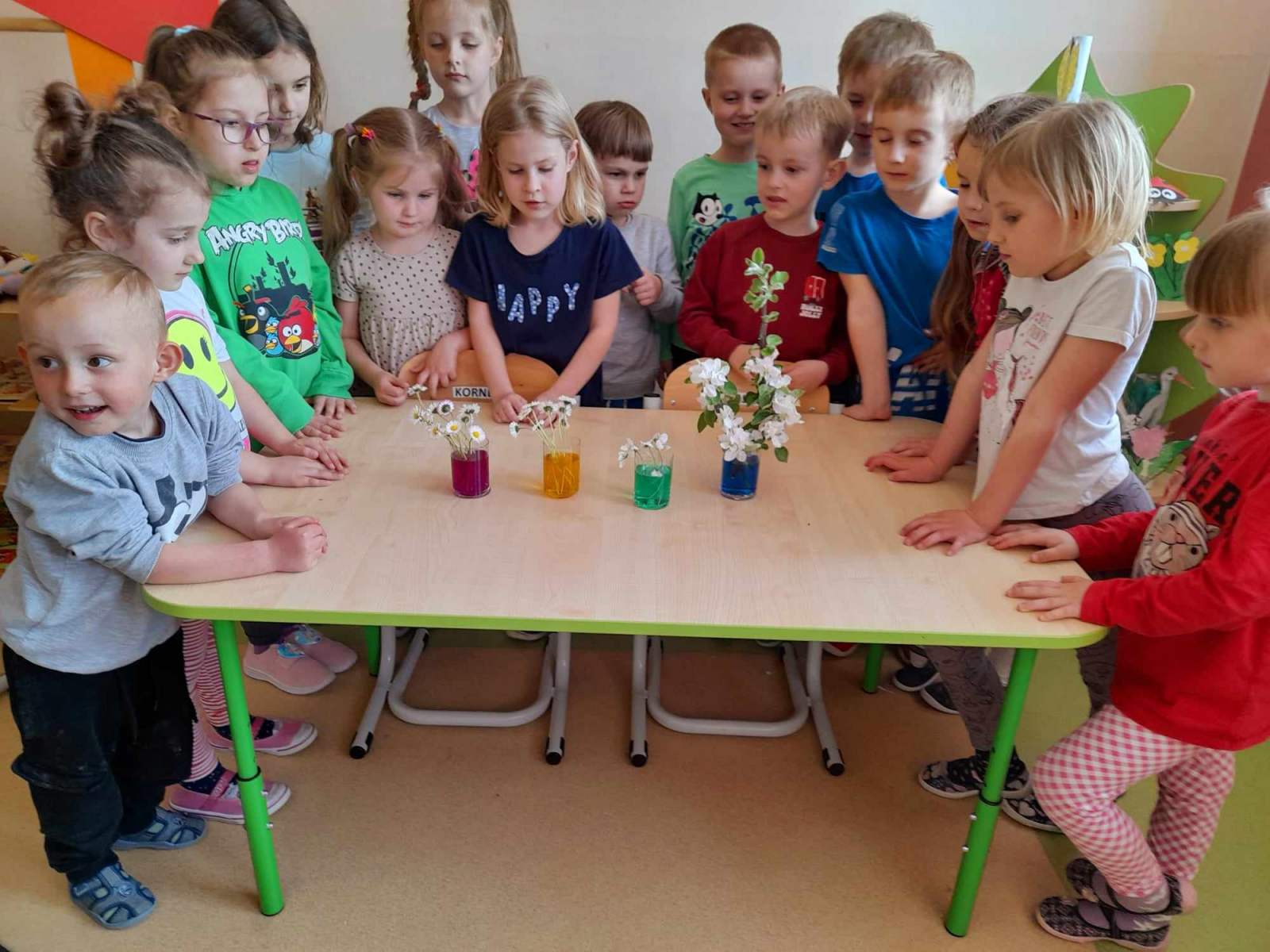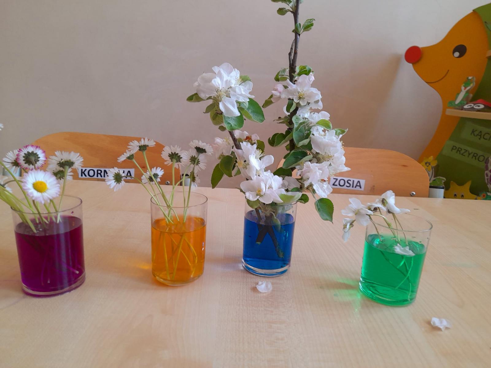W poniedziałek Misie przeprowadziły ostatni eksperyment pt. „Tęczowe kwiaty”. Napełniły cztery szklanki wodą, zabarwiły wodę kolorową bibułą, a następnie włożyły do nich białe kwiatki. Obserwacje prowadziły przez, kilka godzin. Zabarwiona wodą wciągana jest przez łodygę w górę, w kierunku liści i kwiatów. Był to bardzo efektowny eksperyment, sprawił dzieciom dużo radości, przedszkolaki pozyskały nowe wiadomości.